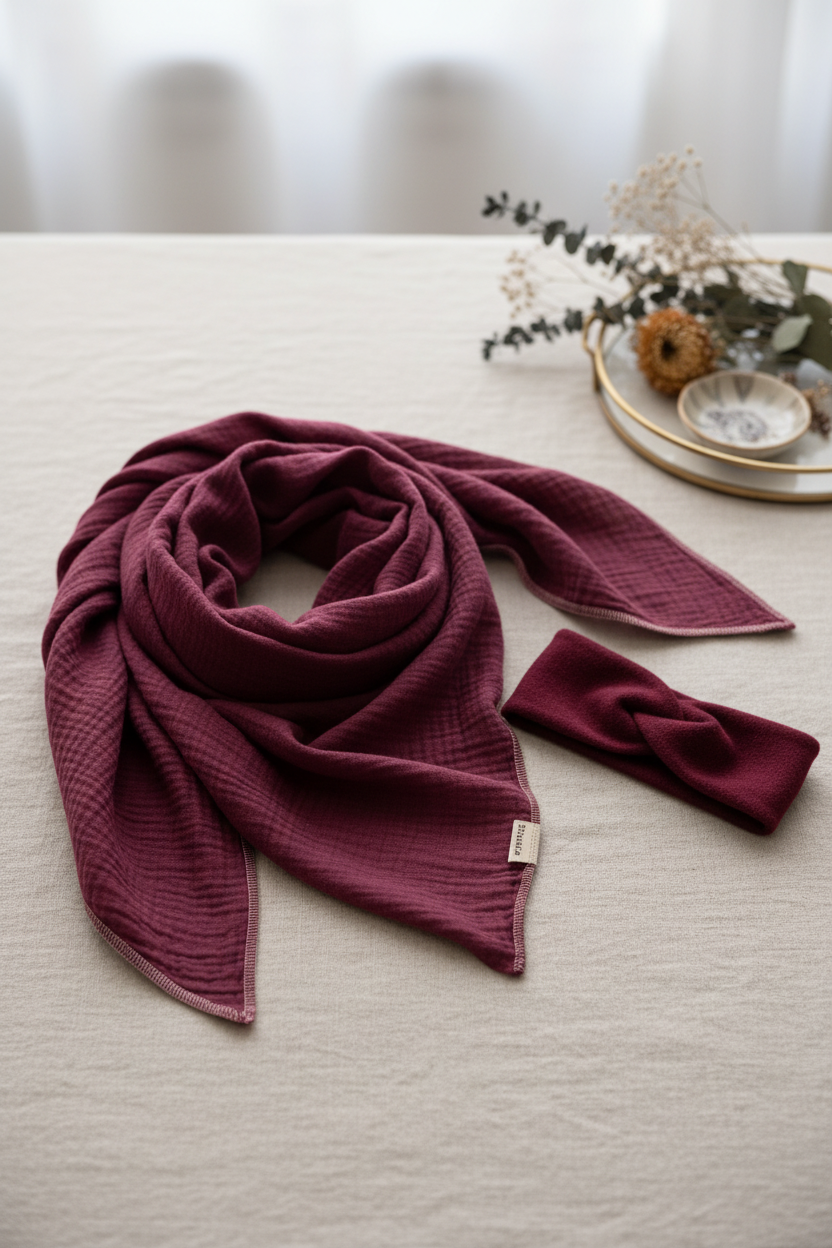 XXL Musselintuch Dreieckstuch mit Stirnband Walklodenstirnband bordeaux